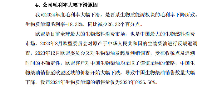 生物质能源业务根据问询函回复显示因欧盟反倾销终裁税率高达35.6%,公司生物柴油对欧出口业务近乎停滞。2024年该业务收入同比下降76.64%,毛利率暴跌至-18.32%。