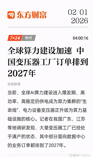 “全球算力建设加速,中国变压器工厂订单排到2027年”这一消息直接利好安靠智电(股票代码:300617),原因如下: