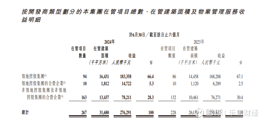 截至2024年6月30日,领悦服务集团签约项目272个、签约建筑面积3570万平方米,在管项目267个、在管建筑面积3170万平方米。