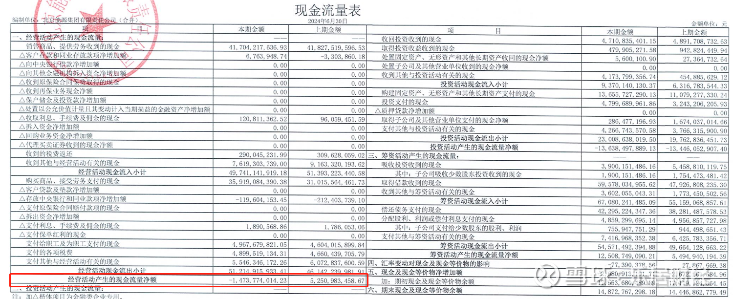 2024年上半年,经营活动产生的现金流净额为-14.74亿元,上年同期为52.51亿元,由正转负。