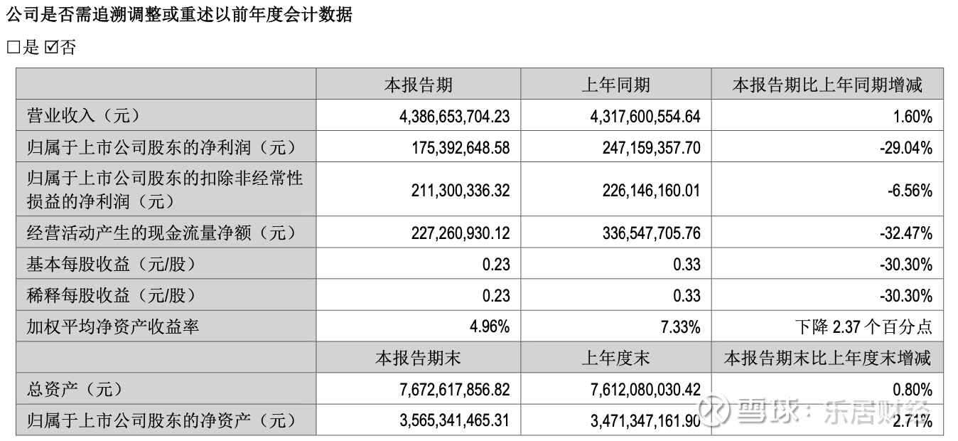 8月30日其发布半年度业绩报告称,2024年上半年营业收入约43.87亿元,同比增加1.6%;归属于上市公司股东的净利润约1.75亿元,同比减少29.04%;基本每股收益0.23元,同比减少30.3%。