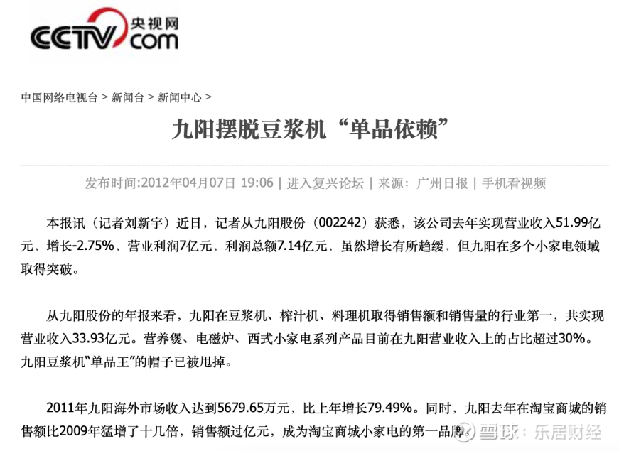 十年后,到2022年仍有公开报道显示:“一直以来,豆浆机是九阳的核心“命脉”。在众多消费者认知里:九阳≈豆浆机。为降低对豆浆机单一品类的依赖程度,九阳积极实施多元化产品战略。”