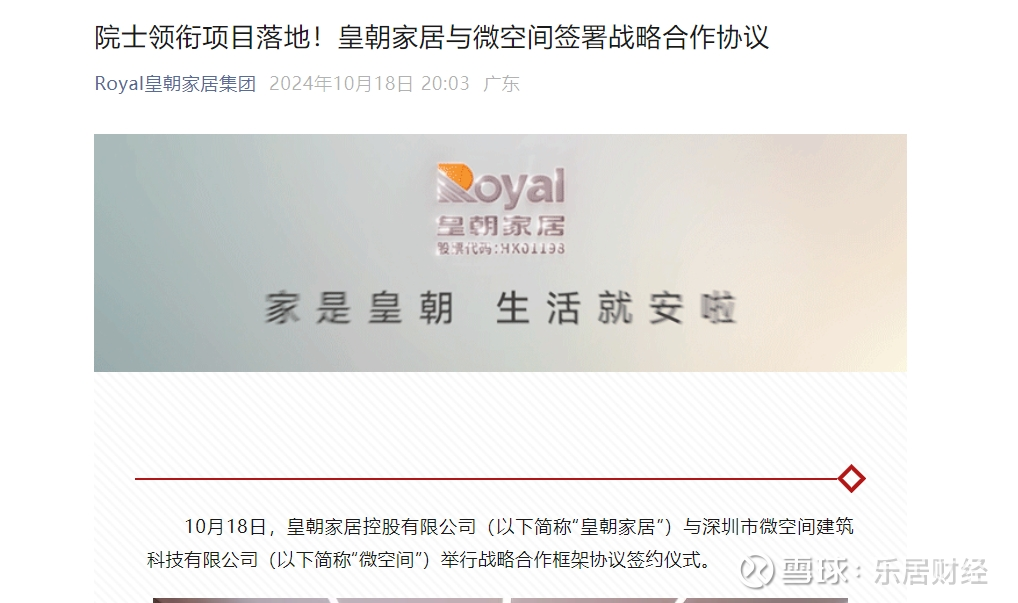 乐居财经 李兰 10月21日,皇朝家居控股有限公司(以下简称“皇朝家居”)与深圳市微空间建筑科技有限公司(以下简称“微空间”)举行战略合作框架协议签约仪式。皇朝家居董事会主席、首席执行官林如海,皇朝家居裕发工装事业部董事长兼总经理钟裕华等出席。