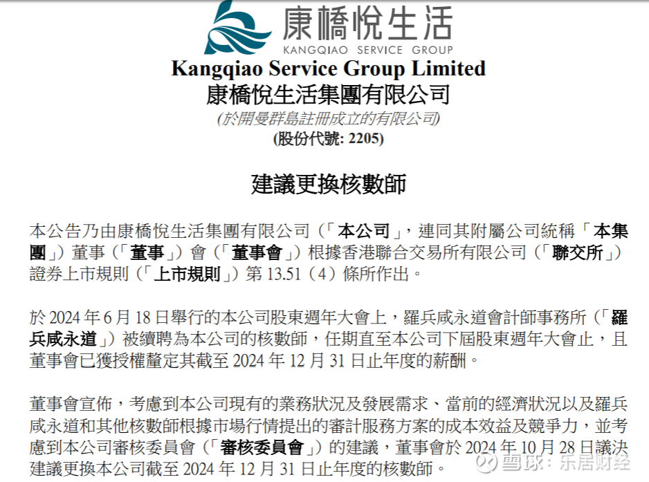 乐居财经 王敏10月28日,康桥悦生活(02205)发布公告,建议更换核数师。
