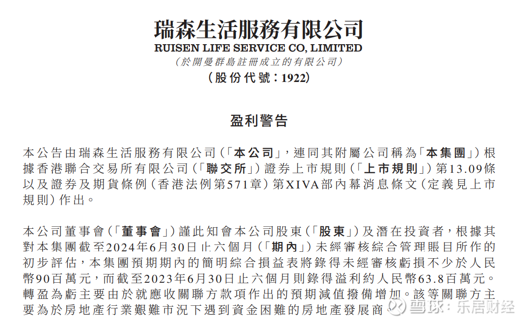 瑞森生活服务表示,转盈为亏主要由于就应收关联方款项作出的预期减值拨备增加。该等关联方主要为于房地产行业艰难市况下遇到资金困难的房地产发展商。