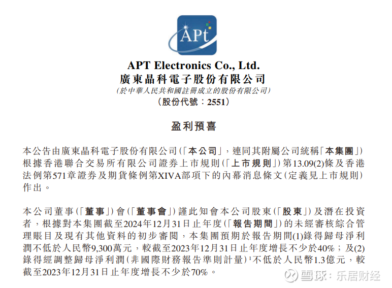 2月7日,晶科电子股份(02551.HK)发布公告,截至2024年12月31日止年度的未经审核综合管理账目及现有其他资料的初步审阅,集团预期于报告期间录得归母净利润不低于9300万元,较截至2023年12月31日止年度增长不少于40%;及录得经调整归母净利润(非国际财务报告准则计量)不低于1.3亿元,较截至2023年12月31日止年度增长不少于70%。