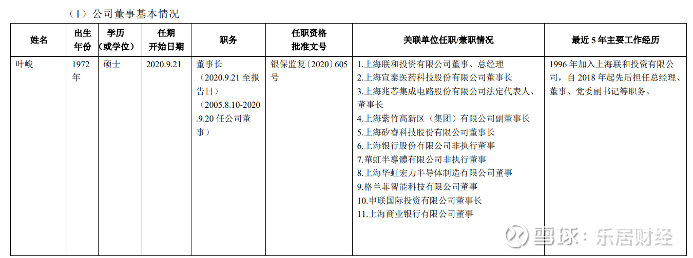 同时,叶峻还在上海联和投资有限公司任董事、总经理;上海宣泰医药科技股份有限公司(SH:688247)任董事长;上海兆芯集成电路股份有限公司任法定代表人、董事长;在上海紫竹高新区(集团)有限公司任副董事长、上海矽睿科技股份有限公司任董事长、上海银行股份有限公司任非执行董事、華虹半導體有限公司非执行董事、上海华虹宏力半导体制造有限公司董事、格兰菲智能科技有限公司董事、申联国际投资有限公司董事长、上海商业银行有限公司董事。