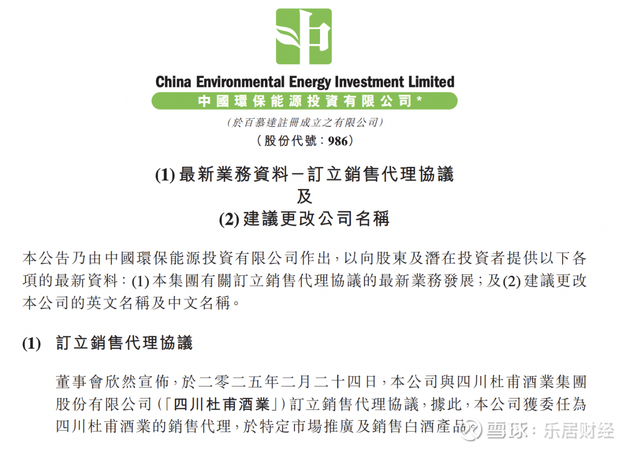 瑞财经 刘治颖2月24日,中国环保能源(00986)公告,于2025年2月24日,公司与四川杜甫酒业集团股份有限公司(下称“四川杜甫酒业”)订立销售代理协议,据此,公司获委任为四川杜甫酒业的销售代理,于特定市场推广及销售白酒产品。