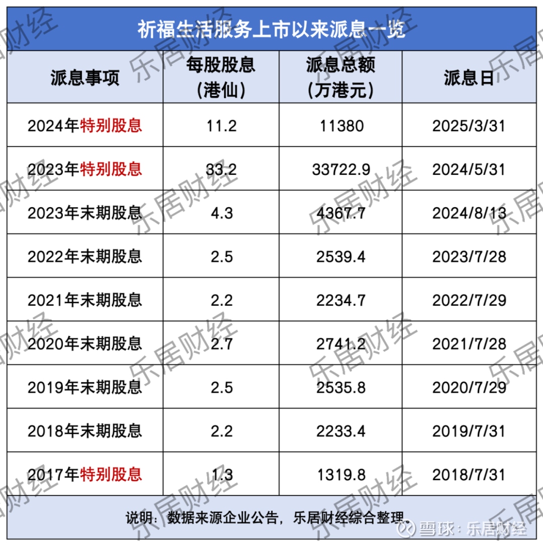 时间线拉长,据乐居财经《物业K线》统计,上市以来,祈福生活服务累计进行了9次派息,派息总额约为6.31亿港元。