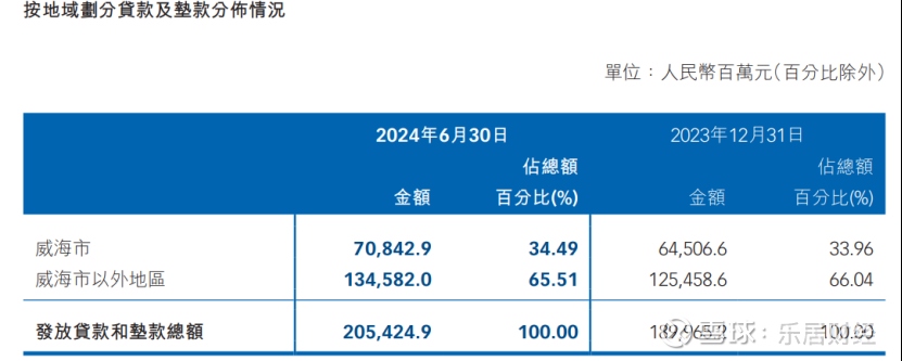 按地域划分贷款及垫款分布,威海市占贷款总额为34.49%,较上年末增加了0.33个百分点,而威海市以外地区占贷款总额65.51%,较上年末有所减少。