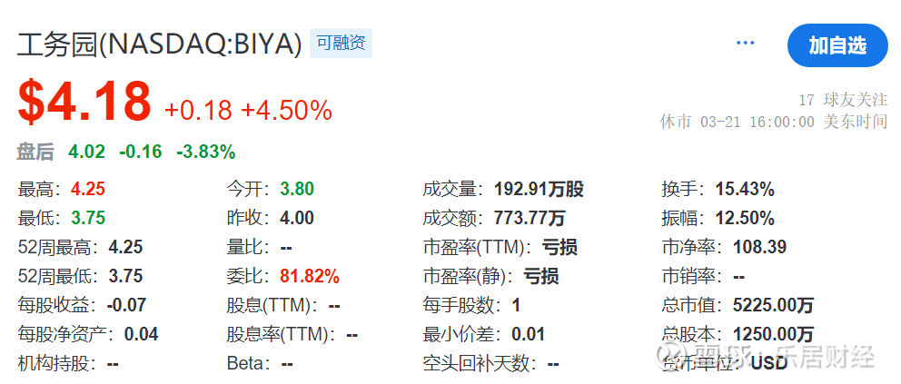 瑞财经 王敏3月21日,人力资源共享平台深圳市工务园网络科技有限公司的实质控股股东Baiya International Group Inc.(以下简称“工务园”)成功在美国纳斯达克上市,其股票代码为BIYA。