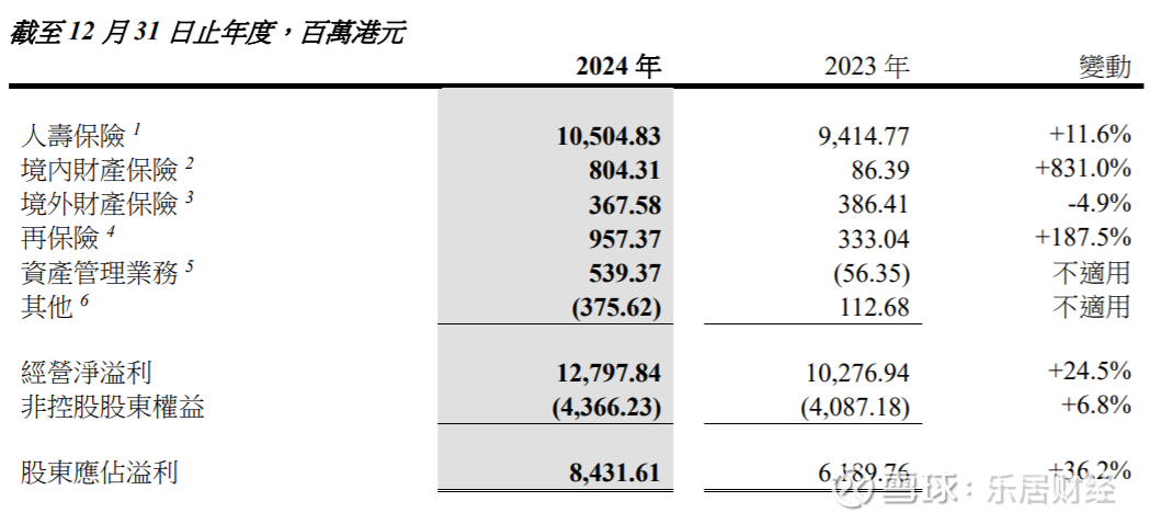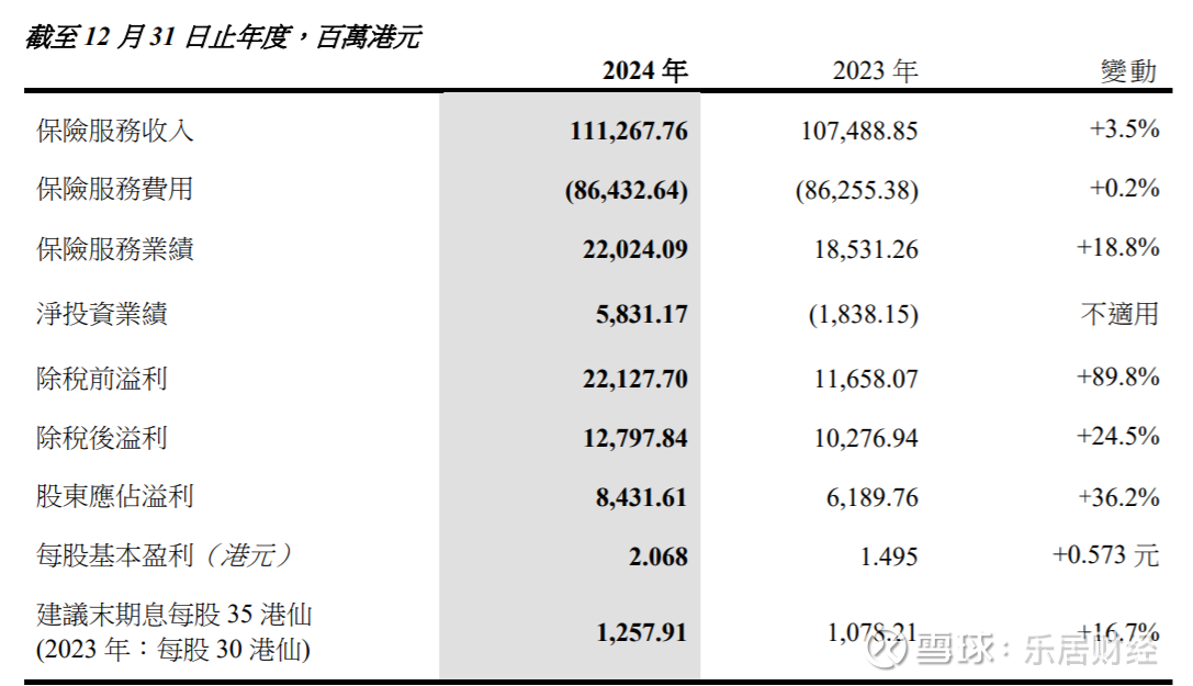 在保险服务方面,2024年,保险服务业绩220.24亿港元,同比增长18.8%;投资回报665.4亿港元,同比接近翻一番,整体经营在2023年较高基数的基础上质效实现全面提升。