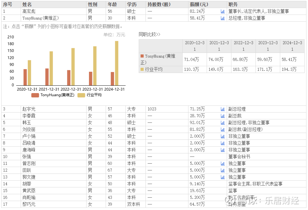 东方财富数据显示,2020年至2024年,黄维正的薪酬分别为71.04万元、74.00万元、66.80万元、59.60万元、58.41万元,连续三年降薪,其薪酬低于副总经理赵宇光的71.25万元、副总经理韩玉的92.01万元、副总经理刘俊丽的81.82万元。