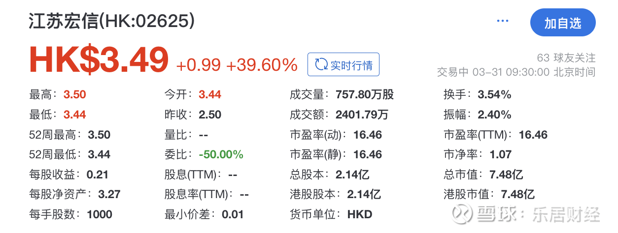 乐居财经 刘治颖3月31日,江苏宏信(HK:02625)在港交所挂牌上市,独家保荐人为绰耀资本,开盘涨39.6%,总市值7.48亿港元。