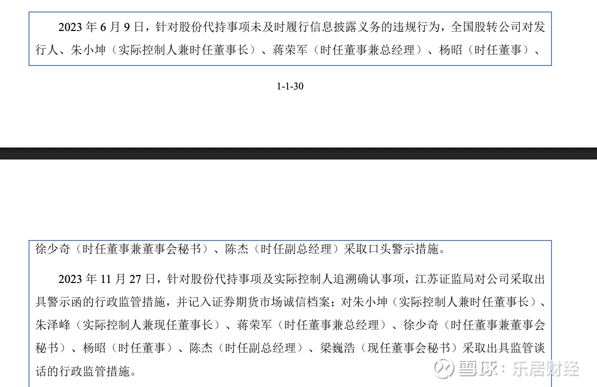 值得注意的是,2023年6月9日,针对股份代持事项未及时履行信息披露义务的违规行为,全国股转公司对天工股份、朱小坤(实际控制人兼时任董事长)、蒋荣军(时任董事兼总经理)、杨昭(时任董事)、徐少奇(时任董事兼董事会秘书)、陈杰(时任副总经理)采取口头警示措施。