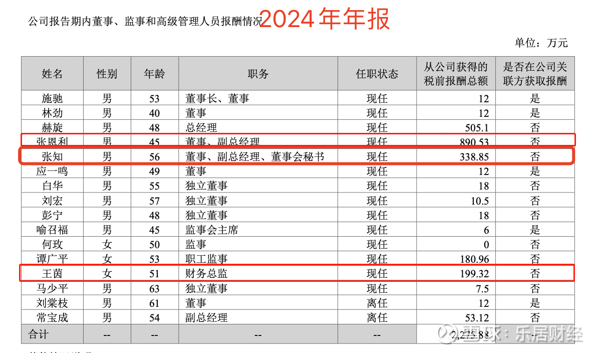 具体来看,2024年,董事、副总经理张恩利的薪酬为890.53万元,较2023年减少591.67万元,降幅39.92%;财务总监王茵2024年薪酬为,较2023年减少了224.88万元,降幅53%;而董事、副总经理、董事会秘书张知2024年薪酬为338.85万元,增加了61.7万元,增幅22.26%。