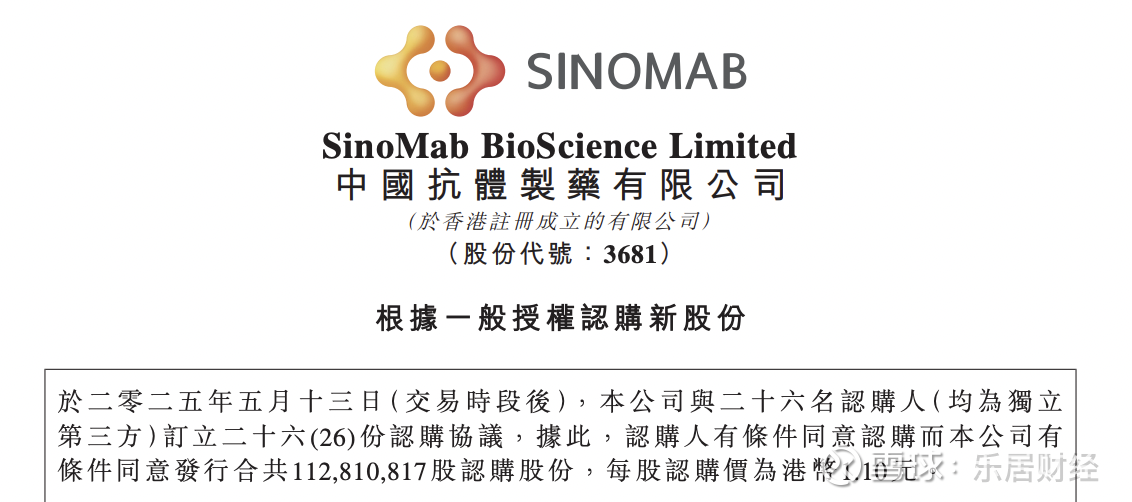 瑞财经 刘治颖5月13日,中国抗体-B(03681)公告,于2025年5月13日,公司与26名认购人(均为独立第三方)订立26份认购协议,公司将向认购人发行合共约1.128亿股认购股份,每股认购股份认购价为港币1.10元,募资约1.24亿港元。