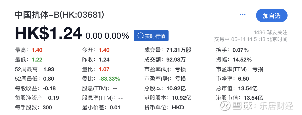 据瑞财社查阅,中国抗体于2019年11月登陆港交所主板,彼时实际募资总额为13.84亿港元。截至发稿,中国抗体每股报1.24港元,总市值约13.54亿港元。