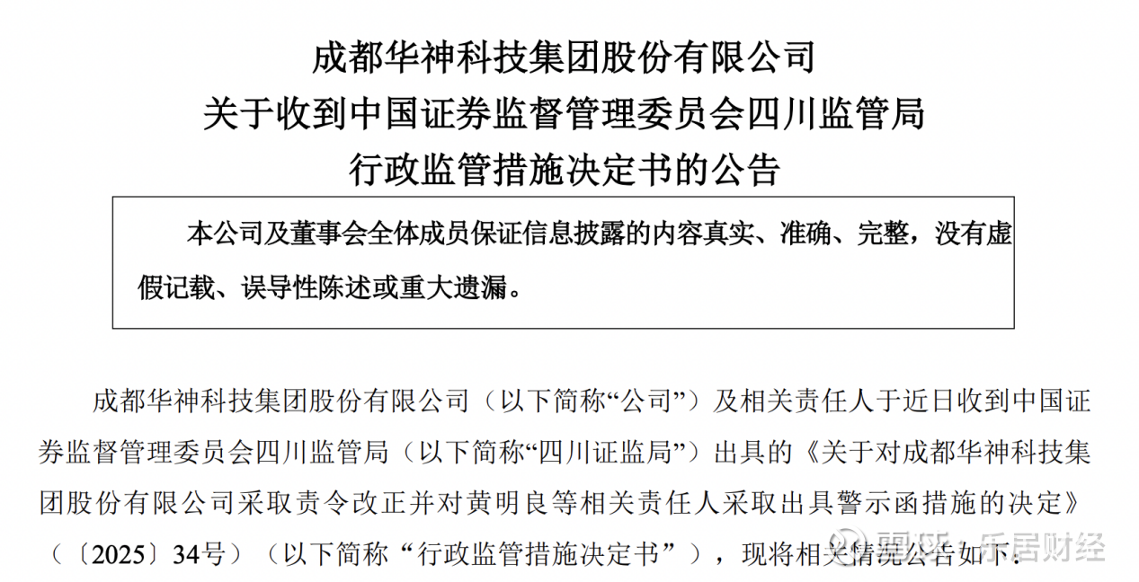 根据相关规定,四川监管局决定对华神科技采取责令改正的行政监管措施,并记入证券期货市场诚信档案。