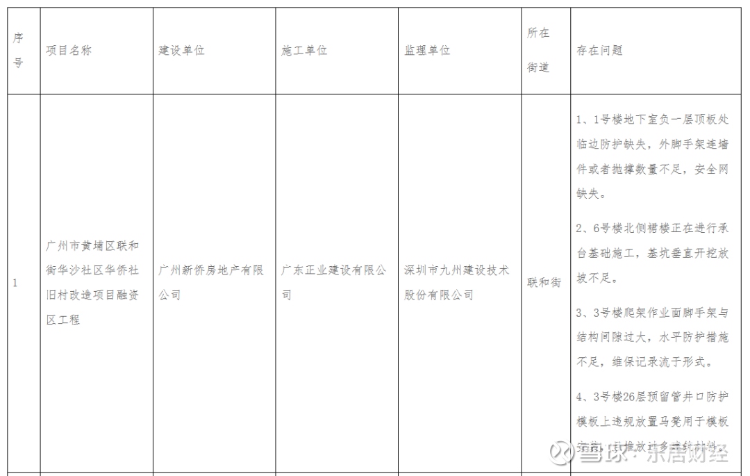 广州市黄埔区联和街华沙社区华侨社旧村改造项目融资区工程因存在以下问题被警示通报: