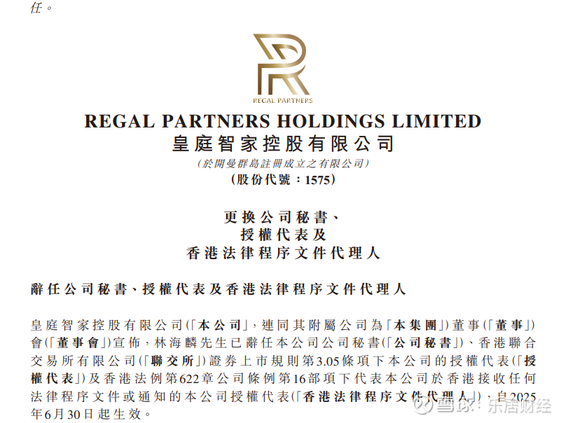 乐居财经 李兰 5月29日,皇庭智家(01575.HK)发布公告,宣布管理层人事变动。公告显示,林海麟辞任公司秘书、香港联交所授权代表及香港法律程序文件代理人职务,上述变动自2025年6月30日起生效。与此同时,董事会正式委任陈永杰先生接任上述全部职务,任期同步生效。