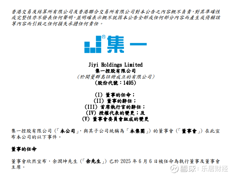 乐居财经 李兰 6月8日,集一控股(01495.HK)宣布董事会多项重大人事变动,涉及董事任命、首席执行官更替、授权代表变更等。