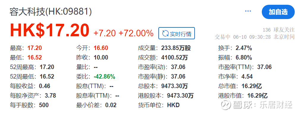 乐居财经 王敏6月10日,容大科技(HK:09881)在港交所挂牌上市,越秀融资独家保荐,开盘涨72%,总市值16.29亿港元。