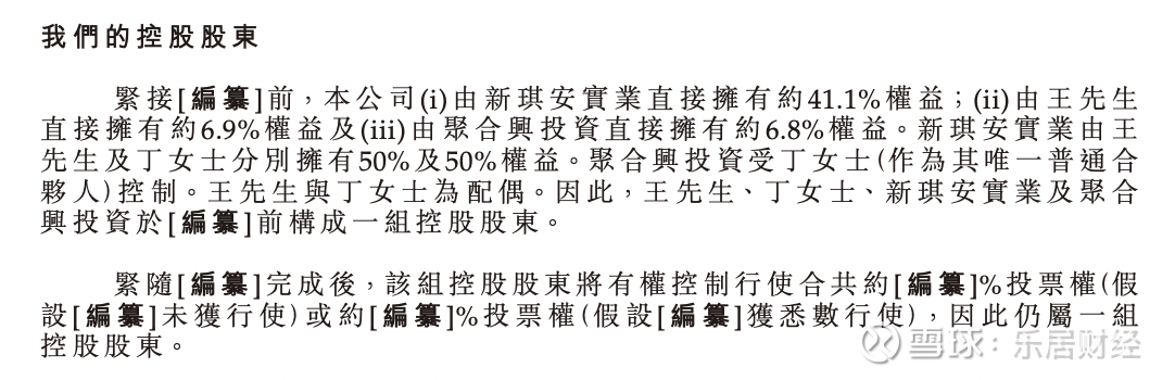 本次IPO前,新琪安由新琪安实业直接拥有约41.1%权益;由王小强直接拥有约6.9%权益及由聚合兴投资直接拥有约6.8%权益。新琪安实业由王小强及丁丹分别拥有50%及50%权益。聚合兴投资受丁丹(作为其唯一普通合伙人)控制。王小强与丁丹为配偶。因此,王小强、丁丹、新琪安实业及聚合兴投资构成一组控股股东,合计持股约54.8%。