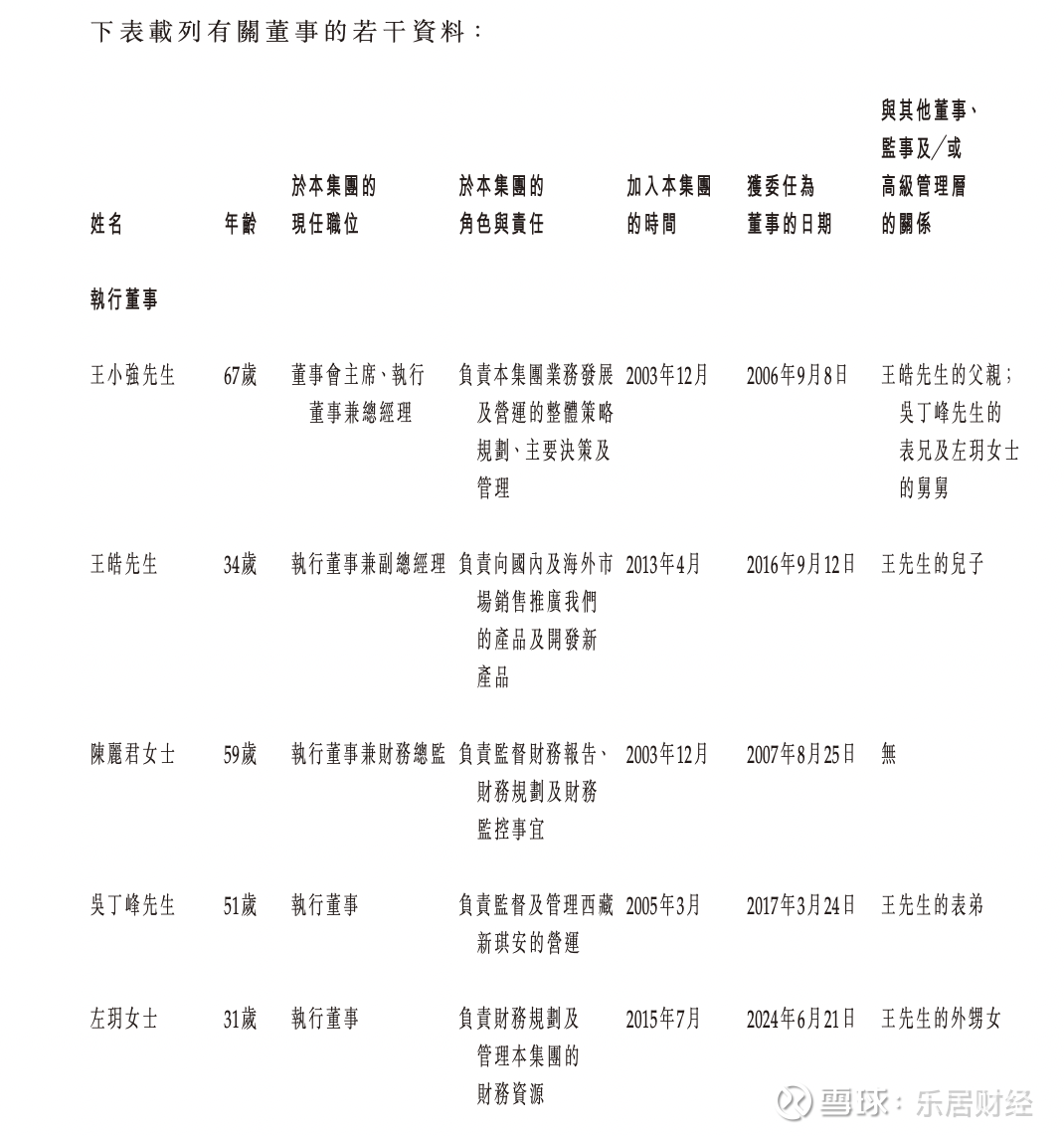 同时,在5名执行董事中,有4位家族成员。公司创始人王小强为公司董事会主席、执行董事兼总经理;其儿子王皓担任执行董事兼副总经理;表弟吴丁峰担任执行董事;外甥女左玥担任执行董事,负责财务规划及管理公司财务资源。