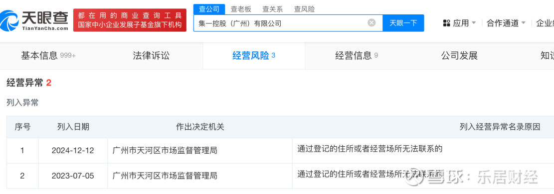 目前,这家集一控股(广州)显示未经营异常,异常的原因是广州市天河区市场监督管理局分别于2023年7月5日和2024年12月12日,均“通过登记的住所或者经营场所无法联系的”。