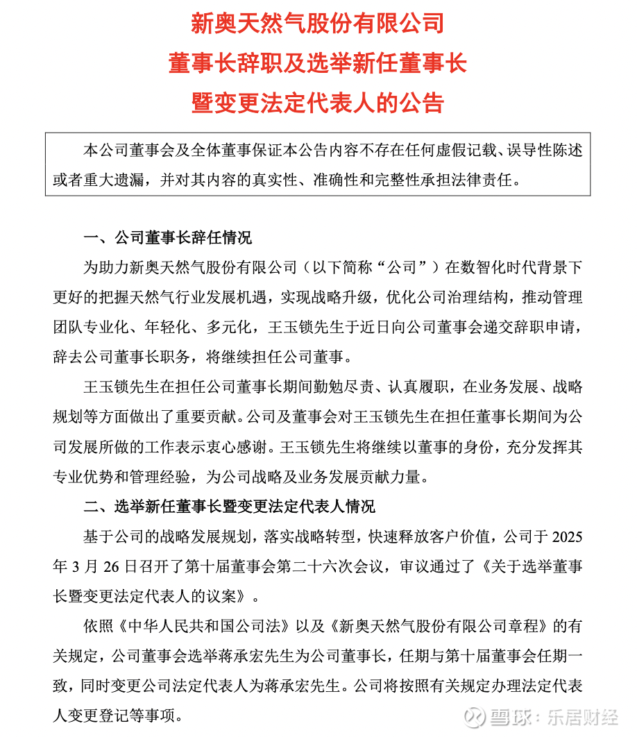 值得注意的是,今年3月,新奥股份公告称,为助力公司在数智化时代背景下更好的把握天然气行业发展机遇,实现战略升级,优化公司治理结构,推动管理团队专业化、年轻化、多元化,王玉锁于近日向公司董事会递交辞职申请,辞去公司董事长职务,将继续担任公司董事。