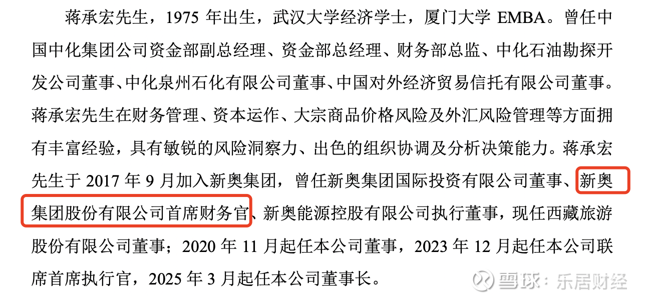 蒋承宏于2017年9月加入新奥集团,曾任新奥集团国际投资有限公司董事、新奥集团股份有限公司首席财务官、新奥能源控股有限公司执行董事,现任西藏旅游股份有限公司董事;2020年11月起任公司董事,2023年12月起任公司联席首席执行官,2025年3月起任公司董事长。