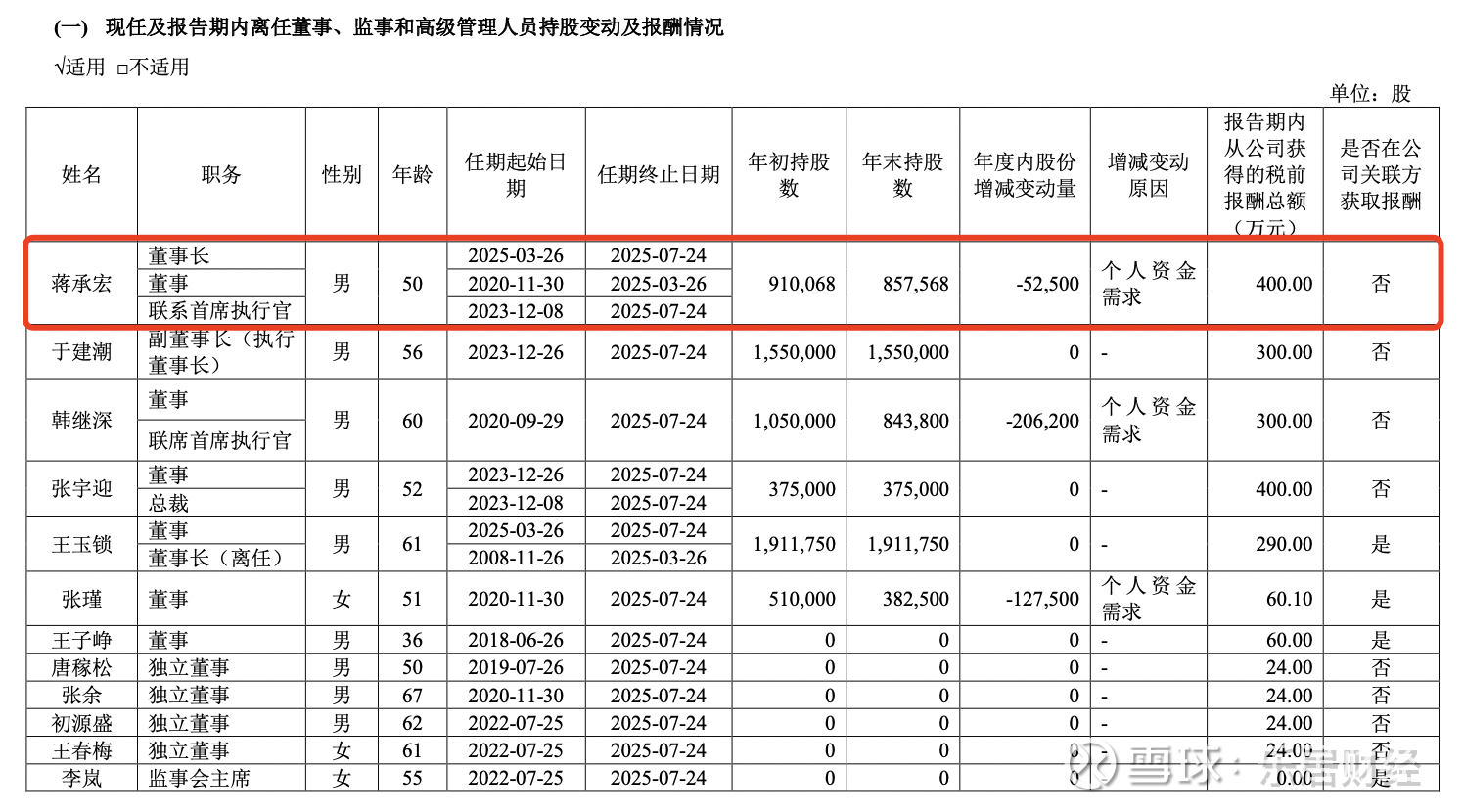 薪酬方面,2024年蒋承宏的年薪为400万元。