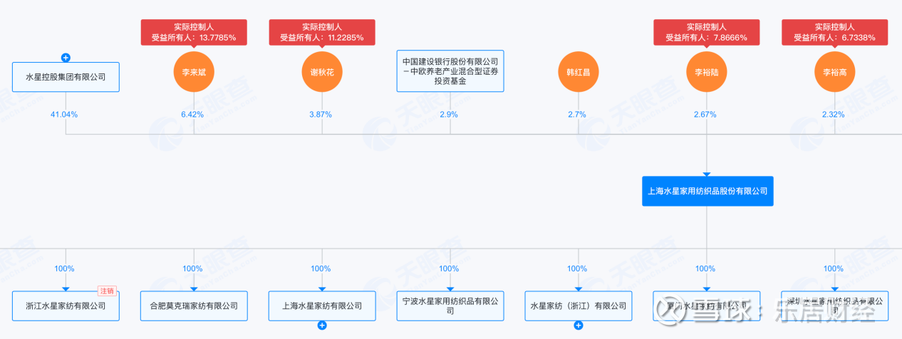 自2017年李来斌兼任水星家纺副董事长至今,其已担任了8年副董事长。目前李来斌是公司实控人之一及第二大股东,最终持股比例约为13.78%。另外,李来斌还是水星家纺最大股东“水星控股集团有限公司”的董事长,持其约17.93%股份。李裕陆的最终持股比例约为7.87%。