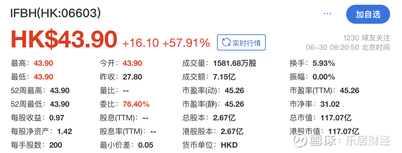 乐居财经 吴文婷 6月30日,if椰子水母公司IFBH(06603.HK)在港交所挂牌上市,中信证券为独家保荐人,其开盘报43.9港元,涨57.91%,总市值约117.07亿港元。
