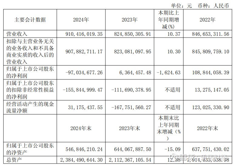 报告显示,亚星化学公司2024年营业收入为9.10亿元,同比增长10.37%;归母净利润为-9703.47万元,同比由盈转亏,下降1624.63%;扣非归母净利润为-1.56亿元,同比下降39.53%;基本每股收益-0.25元。