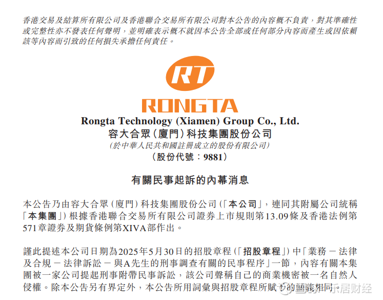 瑞财经 赵盼盼 7月3日,容大科技(09881.HK)发布公告称,公司于2025年7月3日收到福建省厦门市中级人民法院关于一起民事起诉的通知。