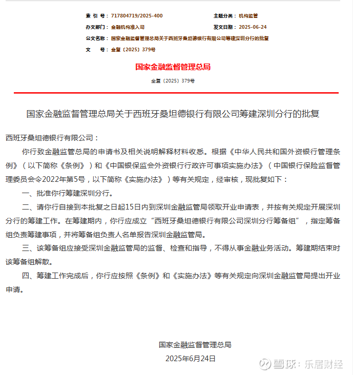 近日,国家金融监督管理总局正式批复同意西班牙桑坦德银行在深圳筹建分行,这是该行继上海、北京之后在中国内地设立的第三家分行,也是其10年来首次在中国内地新增分行。