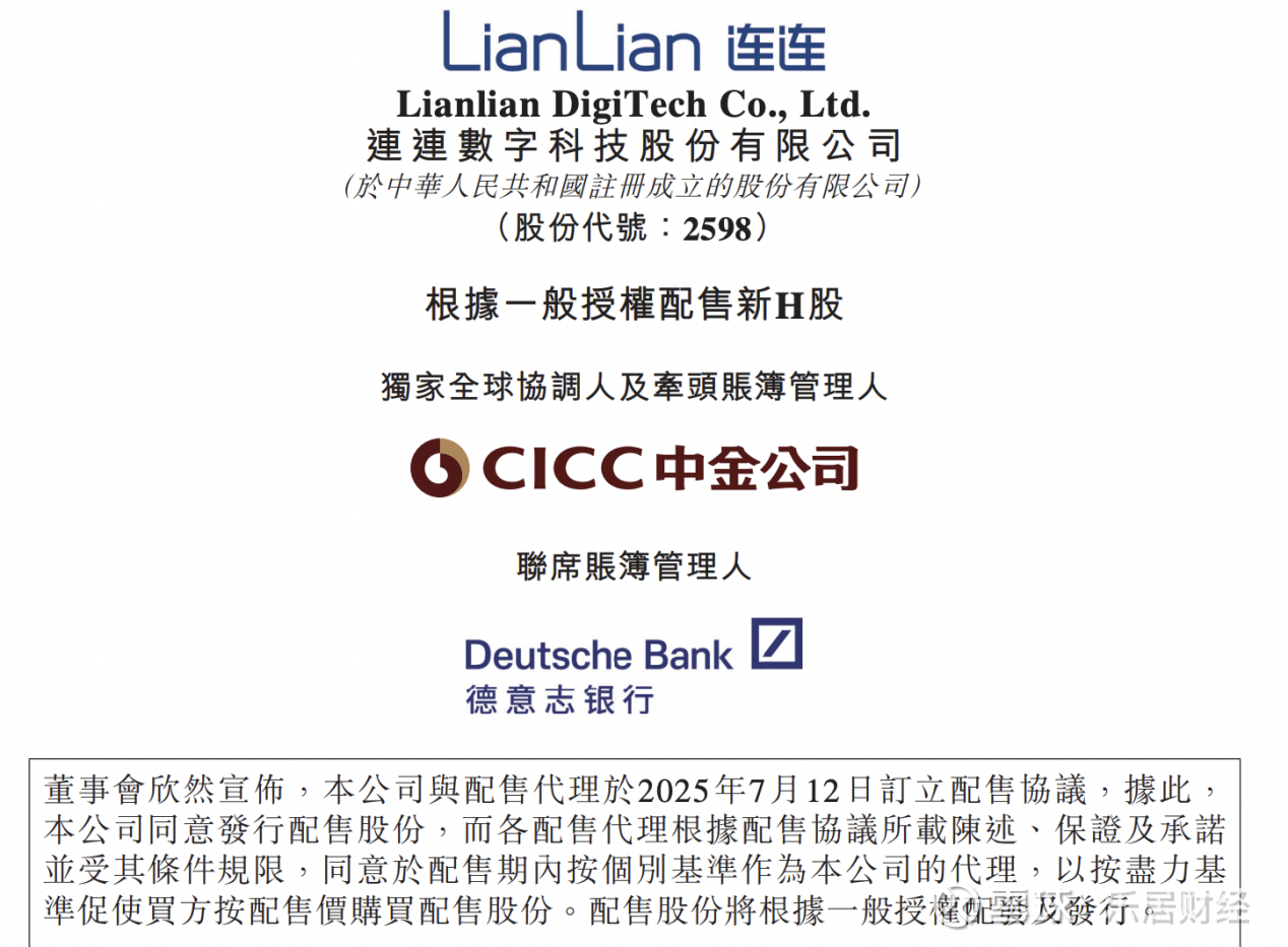 瑞财经 刘治颖7月13日,连连数字(02598)公告,公司与配售代理于2025年7月12日订立配售协议。公司将根据配售协议所列条款并在配售协议所列条件的规限下,发行3840万股公司注册资本中每股面值人民币1.00元的新H股。