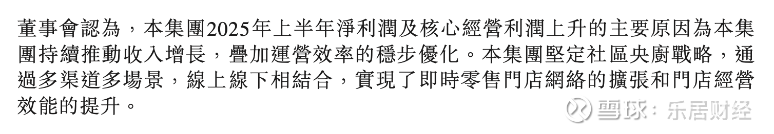董事会认为,集团2025年上半年净利润及核心经营利润上升的主要原因为集团持续推动收入增长,叠加运营效率的稳步优化。集团坚定社区央厨战略,通过多渠道多场景,线上线下相结合,实现了即时零售门店网络的扩张和门店经营效能的提升。