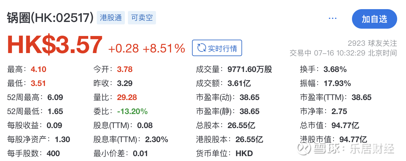 2023年11月2日,锅圈在港交所主板挂牌上市,成为“回家吃饭”第一股。截至7月16日发稿时,其总市值约94.77亿港元。