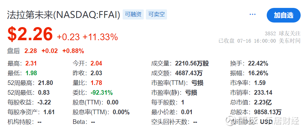 截至7月16日收盘,法拉第未来(NASDAQ:FFAI)涨11.33%,总市值2.23亿美元,市值较上市首日蒸发95%。