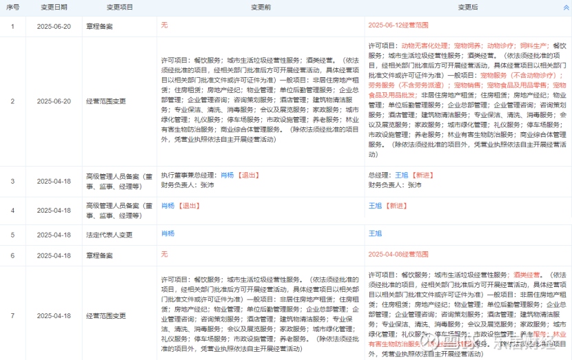 2025年以来,老窖物业变更了法定代表人,从肖杨变更为王旭,经营范围亦发生了两次变更,新增了林业有害生物防治服务、商业综合体管理服务、宠物服务(不含动物诊疗)、宠物销售等。