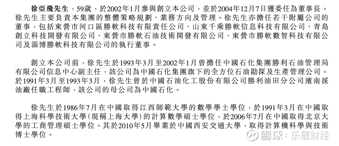 资料显示,徐亚飞,59岁,于2002年1月参与创立公司,并于2004年12月7日获委任为董事长。徐亚飞主要负责集团的整体策略规划、业务方向及管理。徐亚飞亦担任若干附属公司的董事,包括东营市河口区胜软科技有限责任公司、山东千乘胜软信息科技有限公司、青岛创立科技开发有限公司、东营市胜软石油技术开发有限公司、东营市胜软数智科技有限公司及淄博胜软科技有限公司的执行董事。