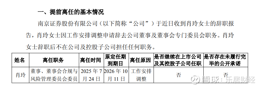 公告显示,南京证券公司近日收到肖玲的辞职报告,因工作安排调整,肖玲申请辞去公司董事及董事会专门委员会职务。其离任时间为2025年7月24日,原定任期到期日为2026年10月11日,辞职后不在公司及控股子公司担任任何职务,且不存在未履行完毕的公开承诺。