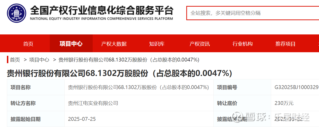 瑞财经 王敏7月28日,据北京产权交易所,贵州银行股份有限公司68.1302万股股份(占总股本的0.0047%)挂牌转让,转让底价为230万元,转让方为贵州江电实业有限公司,披露结束日期为2025-08-22。
