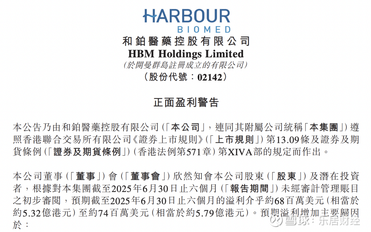 瑞财经 刘治颖7月28日,和铂医药-B(02142)公告,预期截至2025年6月30日止六个月的溢利介乎约6800万美元(相当于约5.32亿港元)至约7400万美元(相当于约5.79亿港元)。