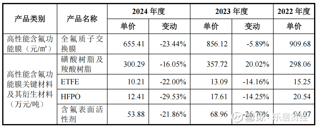 受化工材料行业整体处于去库存周期,以及部分产品竞争对手产能陆续投放及产品下游市场需求增速放缓影响,未来材料全氟质子交换膜、ETFE、HFPO等多个产品面临市场价格下行压力,特别是作为新增长点的全氟质子交换膜,单价从2022年的909.68元/平米,降至2024年的655.41元/平米,缩水27.95%。