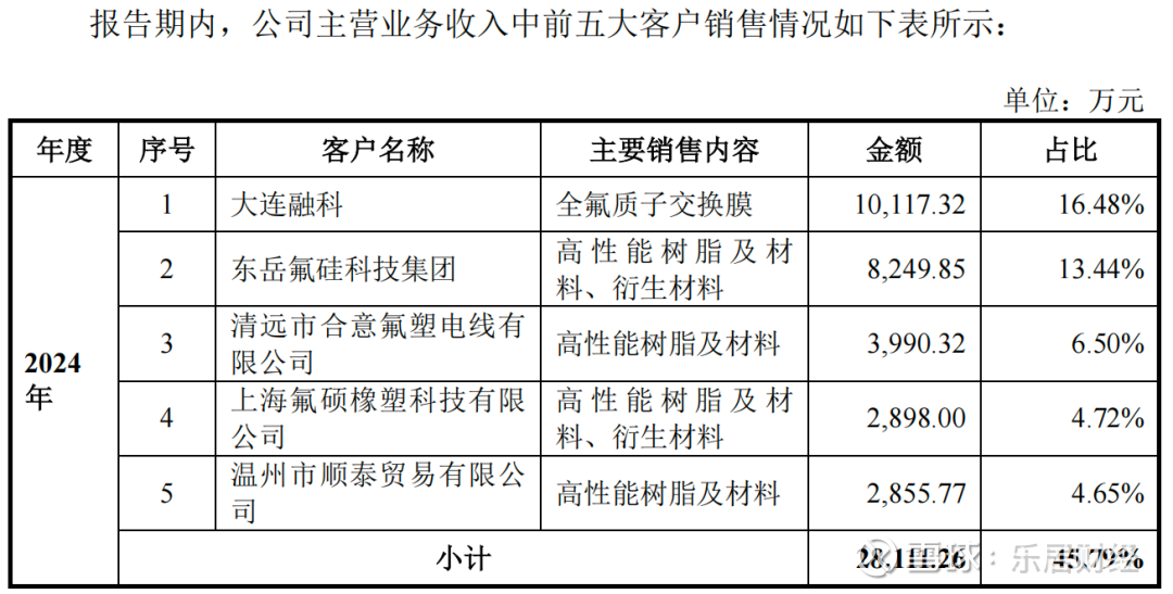 招股书显示,2024年,未来材料总营收同比减少8109.86万元,但全氟质子交换膜销售额同比增长了1.08亿元,其中1.01亿元来自大连融科,贡献了66.45%的全氟质子交换膜业绩,大连融科也在2024年成为未来材料第一大客户,主营业务销售贡献占比16.48%。