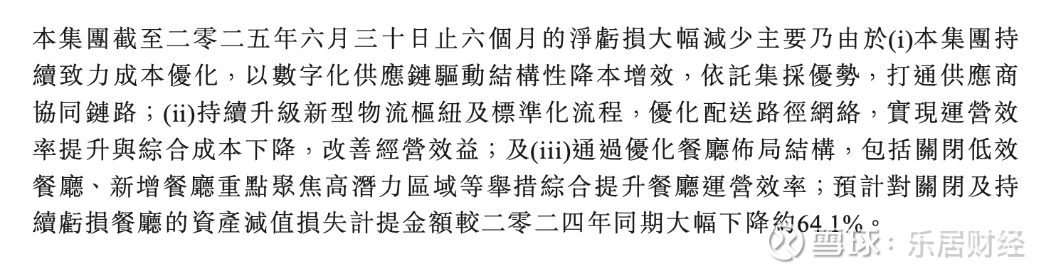 关于业绩变动,呷哺呷哺表示,集团持续致力成本优化,以数字化供应链驱动结构性降本增效,依托集采优势,打通供应商协同链路;持续升级新型物流枢纽及标准化流程,优化配送路径网络,实现运营效率提升与综合成本下降,改善经营效益;及通过优化餐厅布局结构,包括关闭低效餐厅、新增餐厅重点聚焦高潜力区域等举措综合提升餐厅运营效率;预计对关闭及持续亏损餐厅的资产减值损失计提金额较2024年同期大幅下降约64.1%。